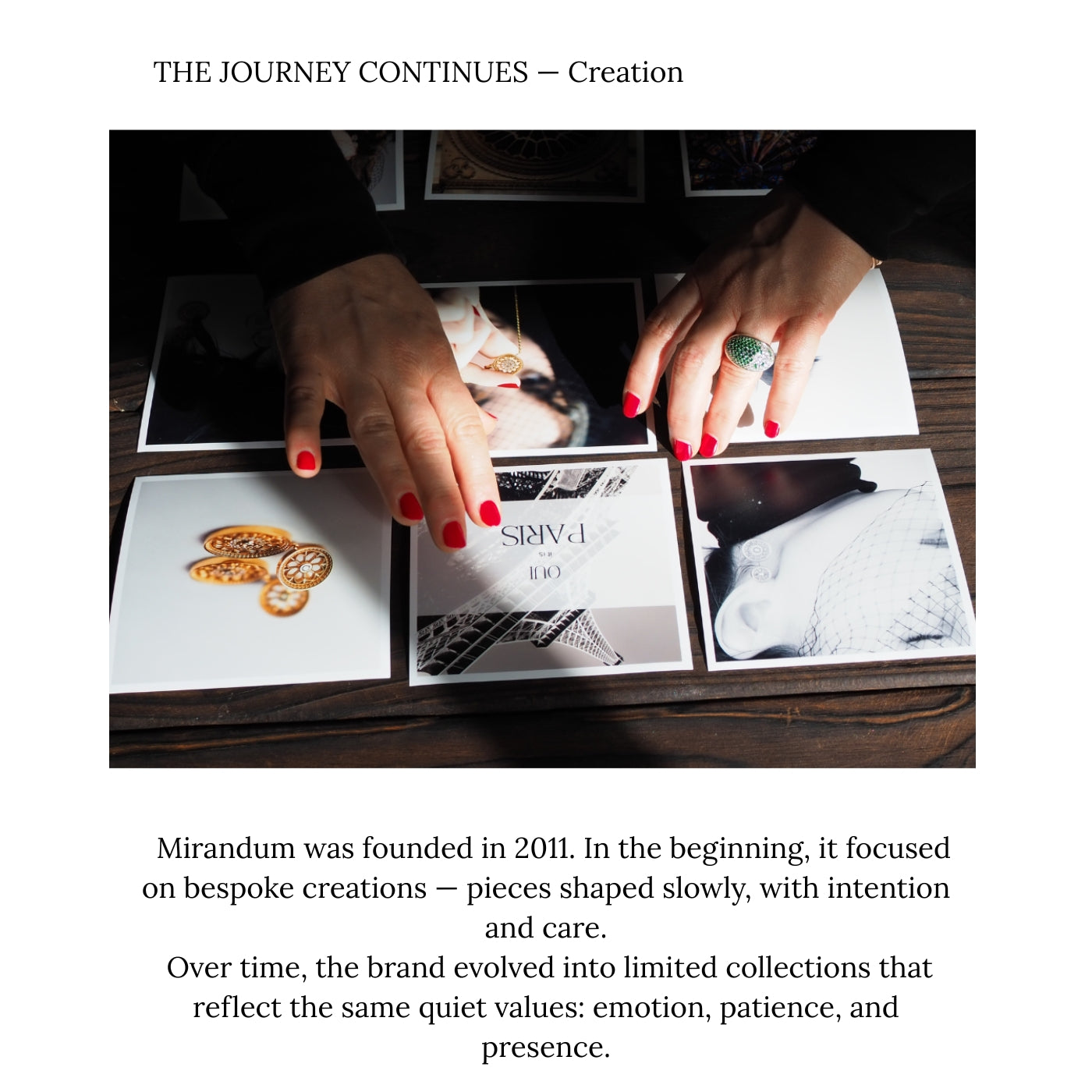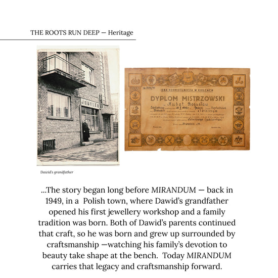 Mirandum Jewellery was created by Agata and Dawid — he, a third-generation jeweller and designer who shapes gold like sculpture, she, a make-up artist and photographer with an eye for light and emotion. Together, they created a space where beauty is felt — where art becomes touch, and craft becomes emotion.